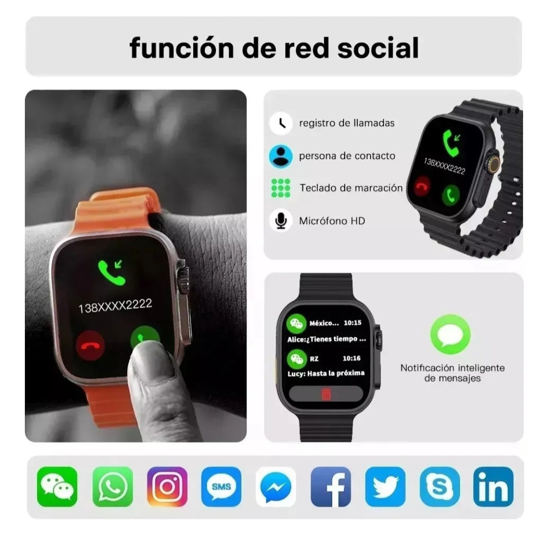 El reloj recibe notificaciones de todas las redes sociales, mensajes,llamadas. Tambien puede realizar llamadas.